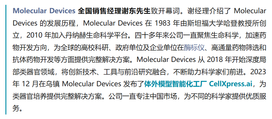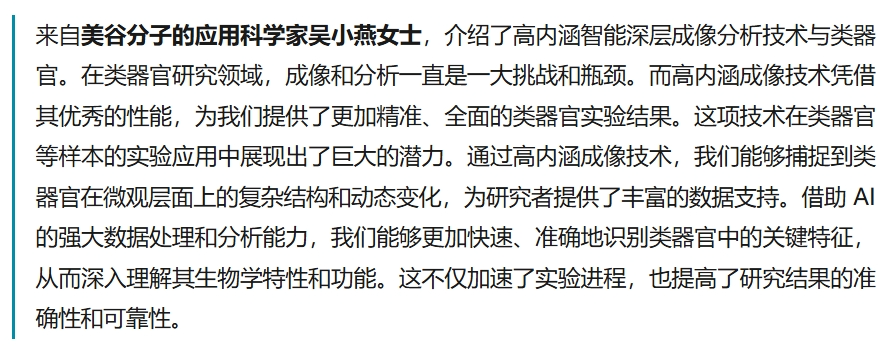 通过此次会议,不仅了解到了最新的高内涵技术运用动态和发展趋势,以及体外模型智能化工厂优异的类器官培养经验和后续产业化相结合的思路。还结识了众多业内专家和同行。我们将继续关注类器官最新进展,不断推动相关技术的研发和应用,为生物医学研究和人类健康事业做出更大的贡献。